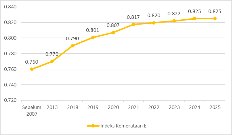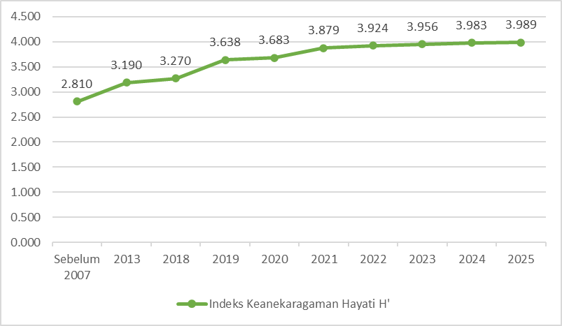 Indeks keanekaragaman hayati (H’ – Shannon-Wiener) dan indeks kemerataan (E – Ludwig & Reynold) flora di Taman Kehati Lido mengalami peningkatan dari tahun ke tahun, seperti ditunjukkan pada Gambar 1. Nilai indeks keanekaragaman hayati pada tahun 2025 adalah 3,989 (mendekati nilai 4). Nilai tersebut menggambarkan kondisi ekosistem sangat stabil, tekanan dari luar rendah, dan produktivitas pertumbuhan tinggi. Sementara itu, nilai indeks kemerataan pada tahun 2025 adalah 0,825 (mendekati nilai 1) yang menggambarkan bahwa jenis flora di Taman Kehati Lido menyebar merata.